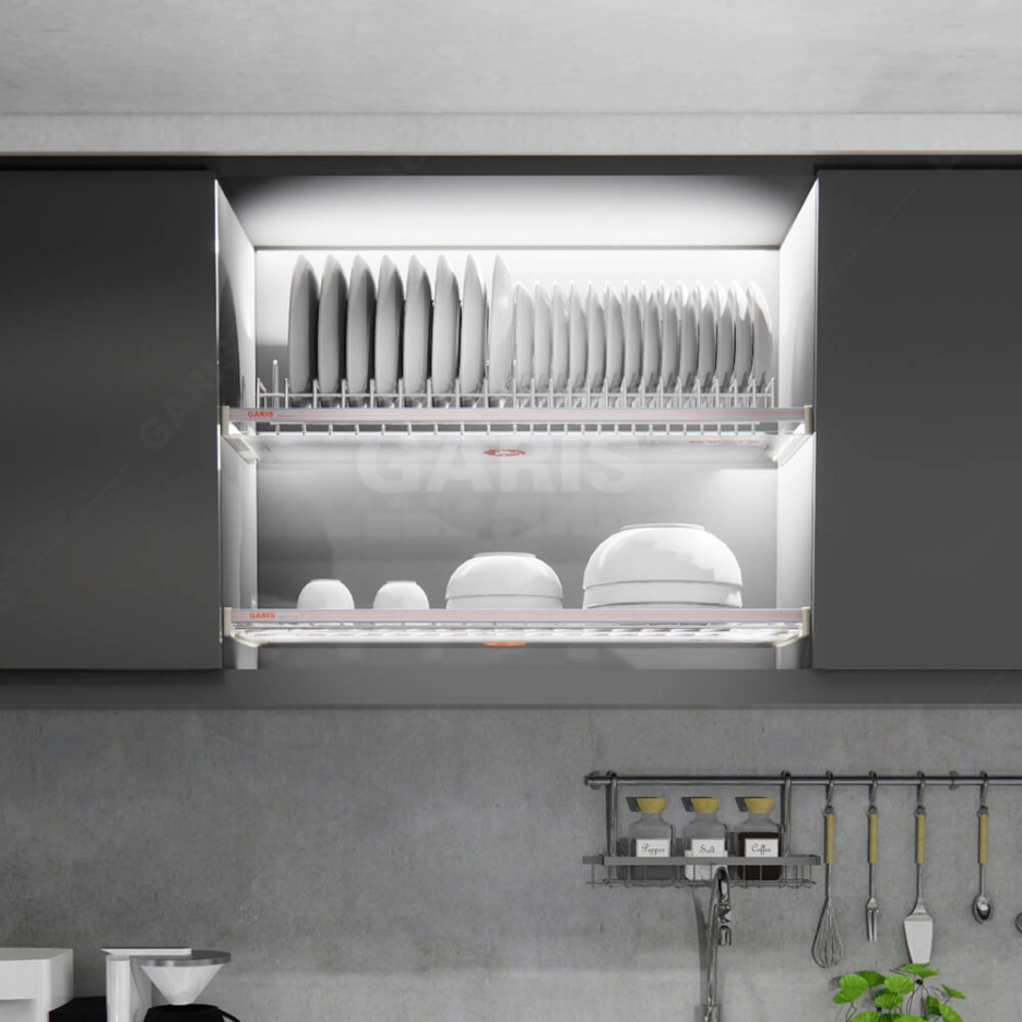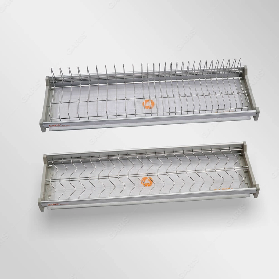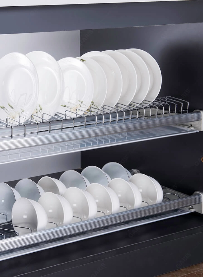 Việc lắp đặt giá để bát đĩa inox 2 tầng ngay trên bồn rửa là mẫu thiết kế kinh điển nhưng không bao giờ lỗi thời dành cho mọi căn bếp, lắp đặt như vậy vừa giúp chủ nhà úp bát đĩa nhanh chóng khi vừa rửa xong cũng như việc nước sẽ nhỏ trực tiếp xuống bồn rửa mà đôi khi không cần phải dùng khay hứng. Hãng GARIS đã phát triển và cho ra đời sản phẩm phụ kiện tủ bếp giá bát đĩa đa năng cố định, nan tròn, bề mặt mạ chrome, 2 tầng, lắp tủ bếp trên.